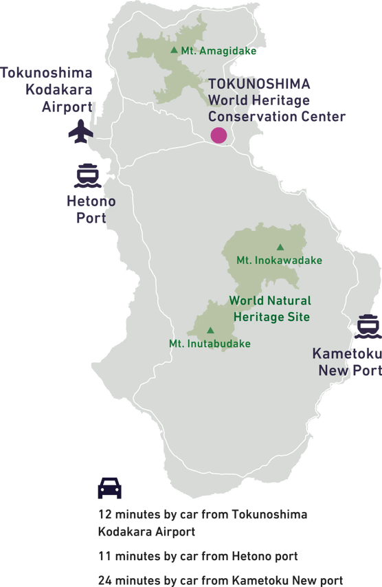 - Haneda Airport Approx. 150 minutes Amami Airport Approx. 35 minutes Tokunoshima Kodakara Airport Approx. 12 minutes World Heritage Conservation Center