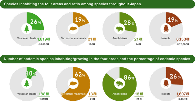 This series of pie charts shows the proportion of species that can be found within the World Heritage Site compared to the total species found across Japan. In particular, mammals such as the Tokunoshima spiny rat and amphibians like the Amami tip-nosed frog and Raffaëlli’s spiny crocodile newt show a particularly high proportion of endemism within the region.