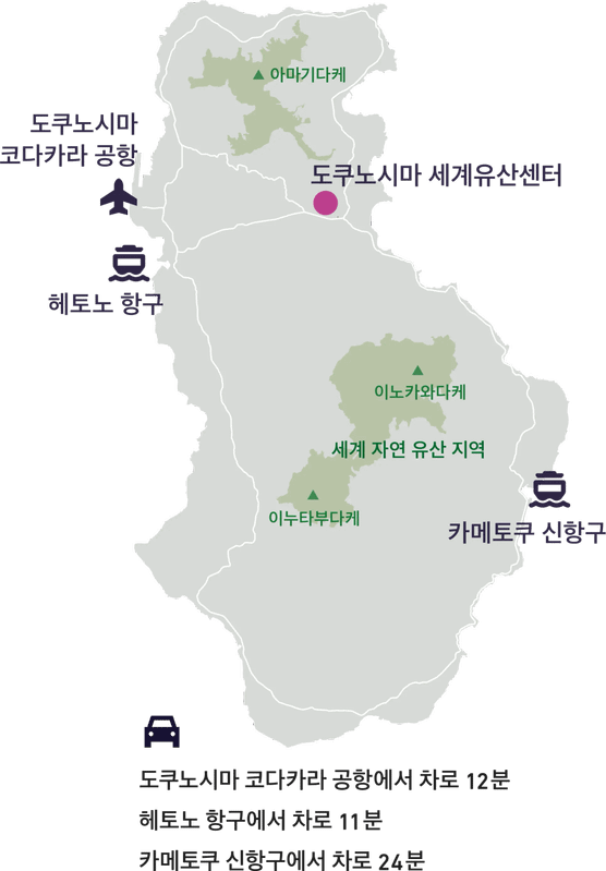 - 후쿠오카 공항 약 55분 가고시마 공항 약 60분 도쿠노시마 코다카라 공항 약 12분 세계유산센터
