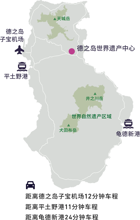 - 羽田机场 约105分钟 鹿儿岛机场 约60分钟 德之岛子宝机场 约12分钟 世界遗产中心